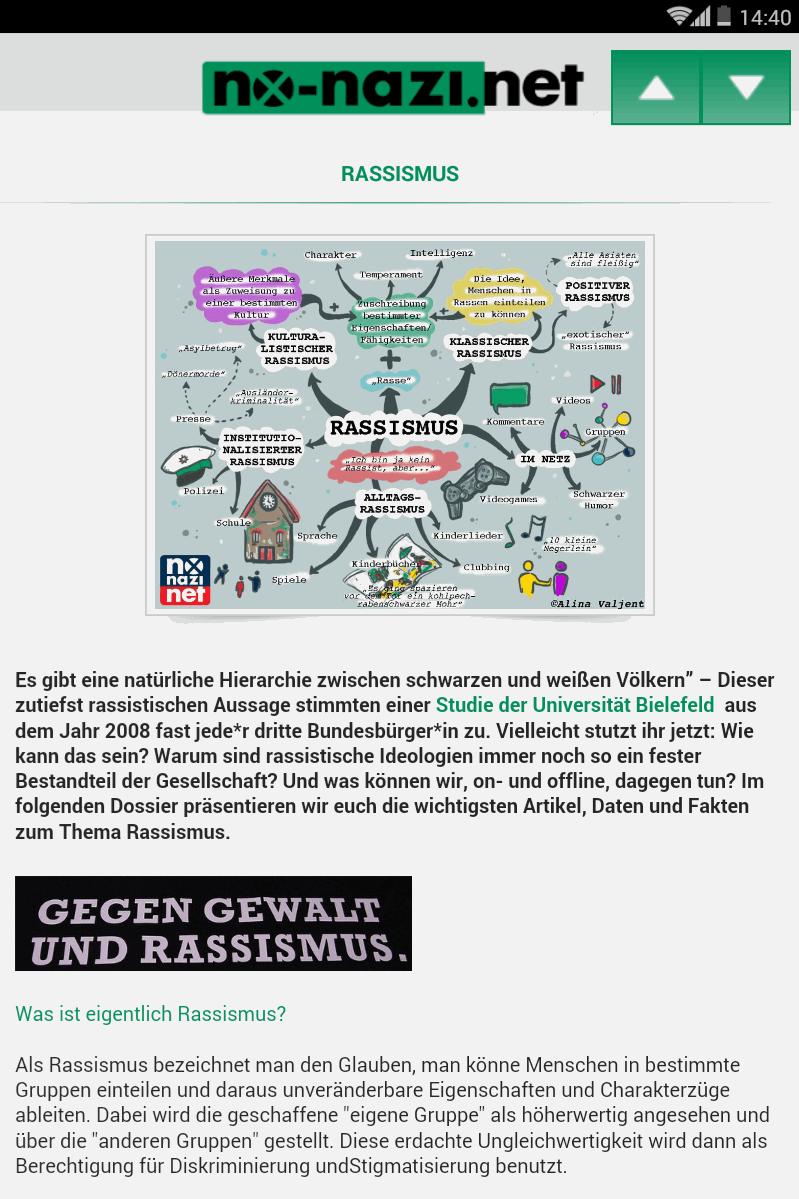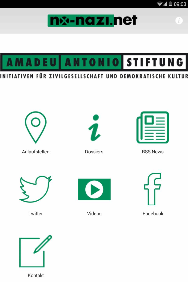 Dengan no-nazi.net -app Anda akan mempelajari strategi mana yang menggunakan neo-Nazi online, mengenal kode dan pengidentifikasi ekstremis sayap kanan dan dapat mengetahui lebih lanjut tentang topik Nazi yang khas. Aplikasi kami menawarkan dokumen yang luas tentang topik-topik seperti "rasisme", "populisme sayap kanan", "homofobia" atau "preferensi neo-Nazi". Kami menawarkan Anda gambaran tentang semua titik kontak penting yang dapat membantu dalam memerangi ekstremisme sayap kanan. Anda juga akan menemukan semua konten yang kami hasilkan dalam proyek no-nazi.net di aplikasi.